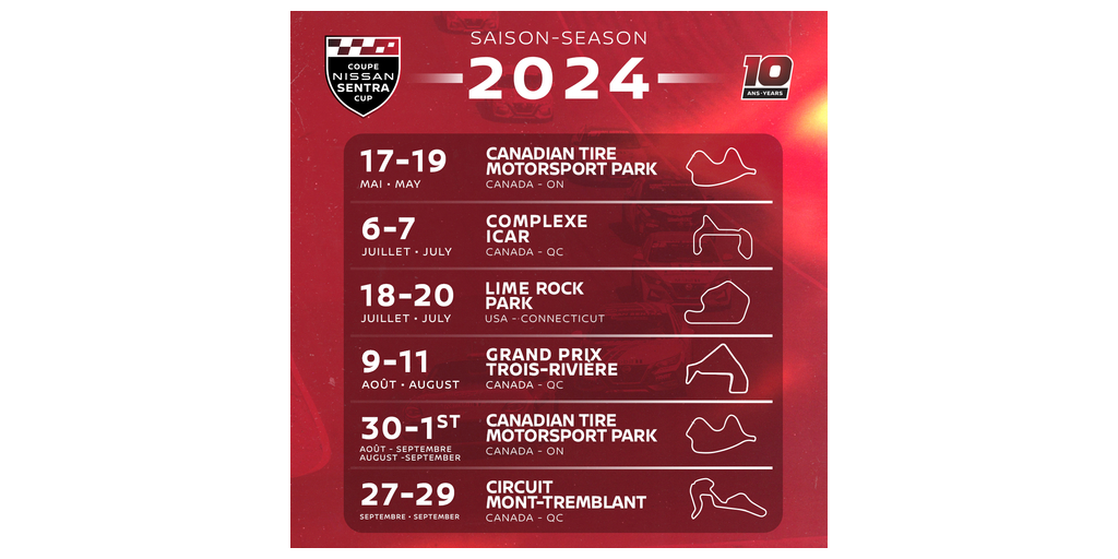 MISSISSAUGA, Ontario–(BUSINESS WIRE)–Nissan Canada and JD Promotion released the official 2024 schedule for the Nissan Sentra Cup today at the Montreal International Auto Show. The Canadian Motorsport Series’ 10th season will feature six events across five venues in Québec, Ontario, and for the first time in the series’ history, the US.